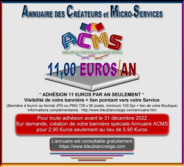 Vous êtes Créatrices ou Créateurs, vous avez une Boutique sur le Web, une Mercerie, une Boutique via les réseaux sociaux, ou un micro-service à proposer, je vous propose un peu plus de visibilité : intégrez l'annuaire sur une page de mon site en insérant votre bannière ainsi que le lien de votre boutique (Hors Boutique Tricot bébé) pour seulement 0,92 cents par mois.Plus d'informations sur :https://www.bleublancneige.com/annuaire.htm